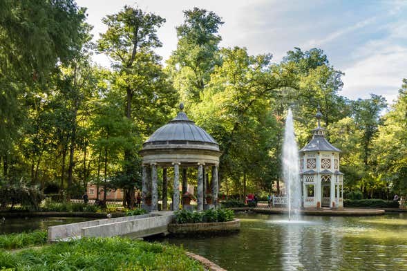 Después, pasaremos junto a otros emblemáticos lugares del Jardín del Príncipe como la Montaña Suiza o la Isla del Ermitaño. Además, también contemplaremos desde el exterior la fachada de la Casita del Labrador: un palacete de estilo neoclásico en el que solían descansar los reyes cuando visitaban este entorno.