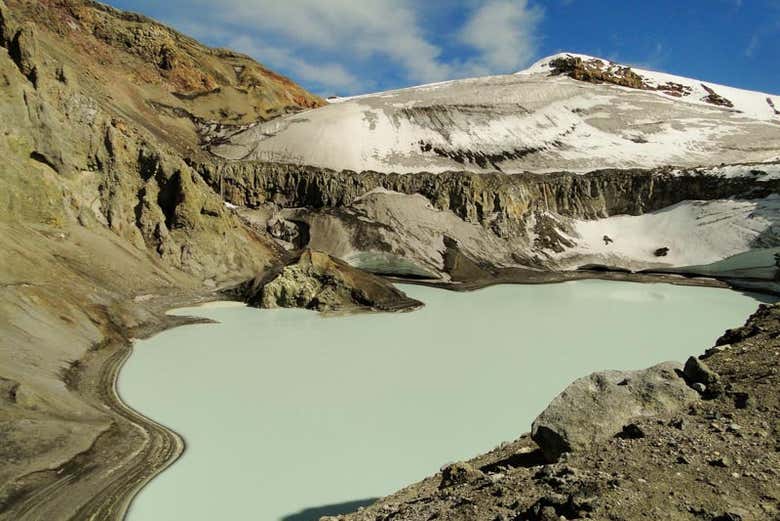 Los picos alrededor de la cumbre y el olor a azufre serán la señal de que estamos llegando a la laguna del cráter. Allí, tendréis media hora de tiempo libre para asimilar el logro mientras descansáis y tomáis una bebida caliente.