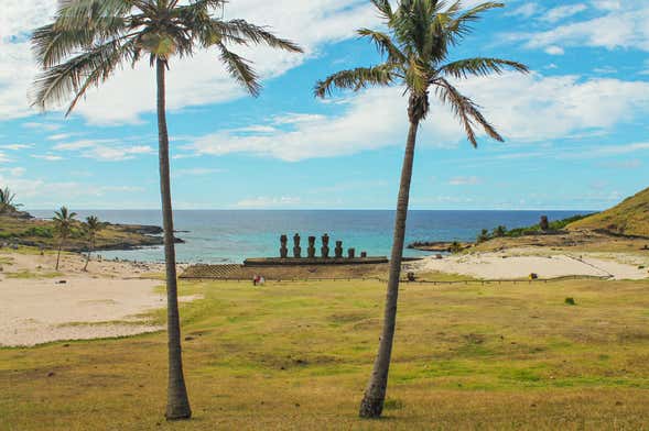 Seguiremos el tour pasando junto al cráter del volcán Rano Raraku y la playa Ovahe, donde podréis disfrutar de un tranquilo ambiente. Finalizaremos la ruta en la playa de arena coralina más grande de la isla, Anakena. Con sus aguas turquesas, coloridos peces y palmeras, os parecerá estar en el mismísimo paraíso.