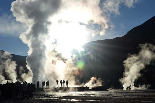 El Tatio es uno de los lugares más visitados del desierto de Atacama. En esta zona, admiraremos de cerca las constantes erupciones de vapor de los más de 100 pequeños cráteres que forman el tercer campo de géiseres más grande del mundo. Pasearemos junto a las piscinas termales y disfrutaremos de un delicioso desayuno mientras contemplamos la actividad geotermal al amanecer. ¡Os enamoraréis!