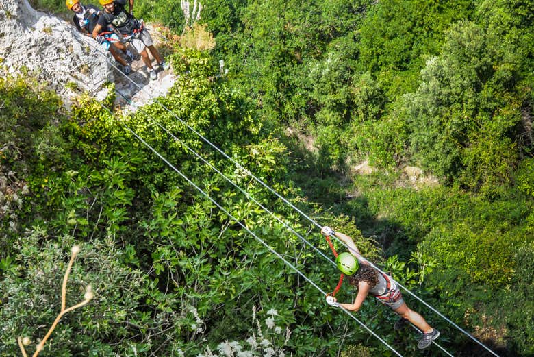 Una vez en la primera pared, comenzaremos con un tramo inicial, que incluye un espectacular desplome de 25 metros. Si lo preferís, podréis optar por un paso alternativo más sencillo para sortear esta sección. Después, el recorrido se volverá más accesible, combinando tramos sencillos con otros más emocionantes, en los que pondremos a prueba vuestra destreza y disfrutaremos de la belleza del entorno.