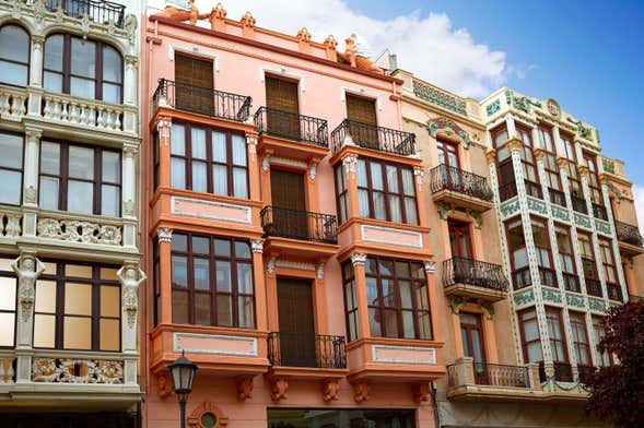 En primer lugar, nos fijaremos en la arquitectura modernista del parque de la Marina Española. Allí veremos su icónico templete, y las fachadas de tres edificios con mucha historia: las casas Peña, Andreu y Pinilla.