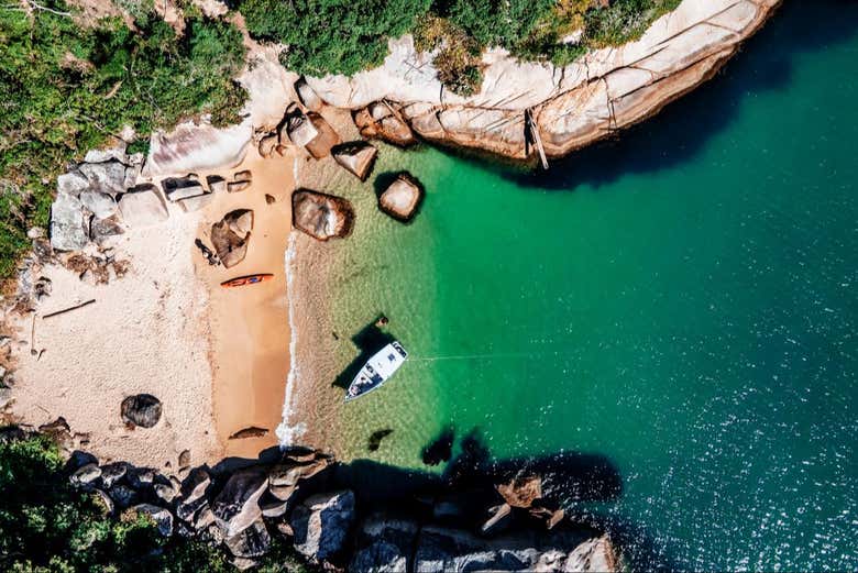 Vous ferez ensuite escale sur la plage de Cação, également connue sous le nom de plage du Trampoline. Là, vous pourrez vous jeter à l’eau depuis le plongeoir du bateau ou glisser sur le toboggan pour une baignade rafraîchissante.