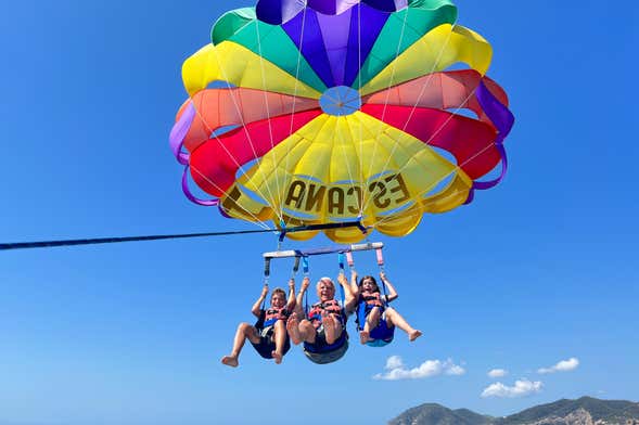 À l'heure convenue, rendez-vous à l'embarcadère D60 du port de Santa Eulalia del Río, où un bateau vous attendra pour vous emmener dans les eaux turquoise de la Méditerranée pour une expérience amusante de parachute ascensionnel à Ibiza. Tous à bord !