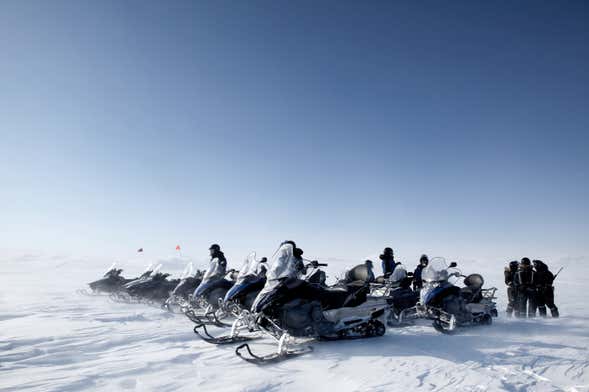 Après être passé vous prendre à votre hôtel à Yellowknife à 11h00, nous quitterons la ville en minibus. Nous nous arrêterons dans des paysages glacés loin du centre-ville et vous commencerez l’aventure en motoneige !