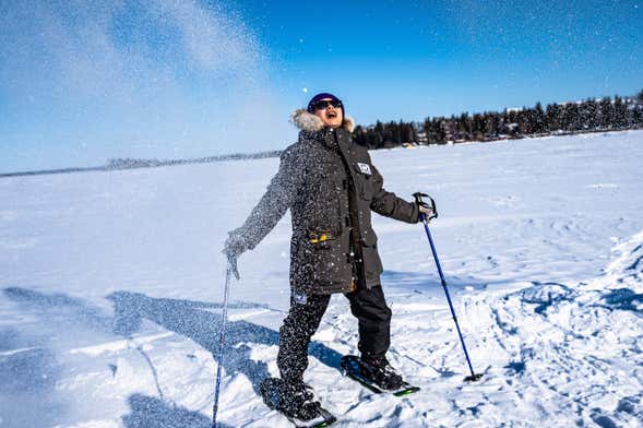 Nous nous promènerons sur les rives du lac. Grâce aux bâtons et aux raquettes, nous aurons un meilleur accès à certains terrains qui seraient autrement impraticables. Tout en appréciant les paysages glacés du Grand lac des Esclaves, nous croiserons également une partie de la faune locale, comme les renards et les perdrix des neiges.