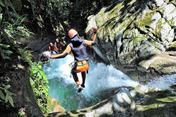 Dopo 45 minuti di viaggio, raggiungeremo la nostra destinazione. Una volta qui, ci addentreremo in un burrone con cinque cascate dai 3 ai 20 metri di altezza. Nel corso dell'itinerario dovremo calarci lungo alcune zip-line, fare discesa in corda doppia, nuotare, fare immersione e, soprattutto, saltare!