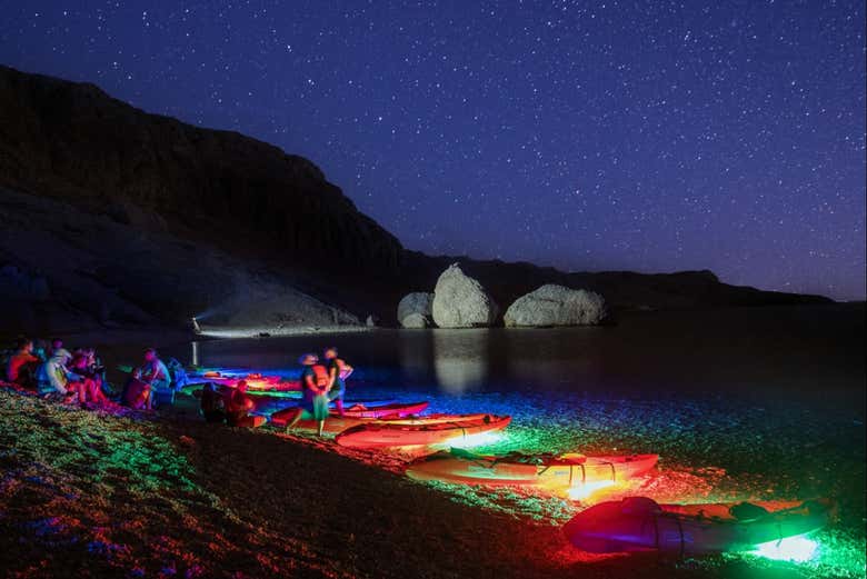 Continuaremos o tour em frente à praia de Slana, onde faremos uma breve pausa para apreciar a vista do fundo marinho cintilante graças às luzes coloridas que iluminam a água sob os caiaques.